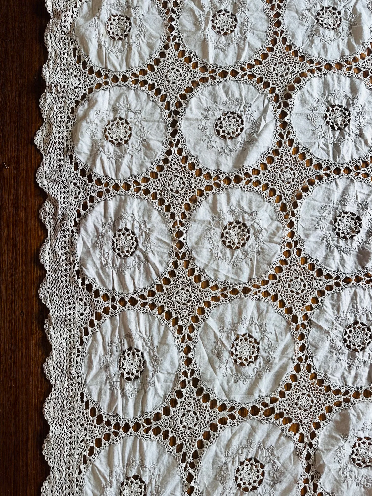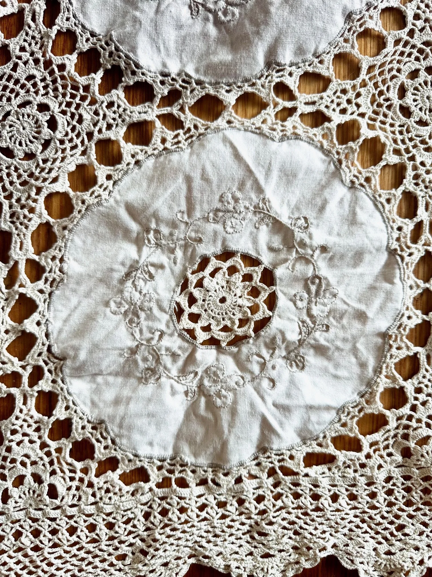 The Miranda Tablecloth has a Picnic at Hanging Rock aesthetic. It is a vintage large oval cotton tablecloth that features embroidery and lace work. This tablecloth could make a Forever dress with beautiful lace hem sleeves or a beautiful lace trim on the hem depending on where you place the pattern.
